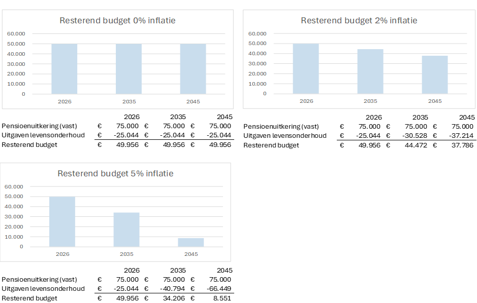 Bij een inflatie van 2% per jaar kun je in 2026 met die €75.000 nog ongeveer €49.956 besteden buiten de kosten van levensonderhoud. In 2045 is dat bedrag gedaald tot slechts €37.786. Dat betekent een koopkrachtverlies van ruim 24% over een periode van ongeveer 20 jaar – zonder dat je uitkering in euro’s verandert. In onderstaande grafieken zie je de verschillen bij een gewijzigd inflatie %: