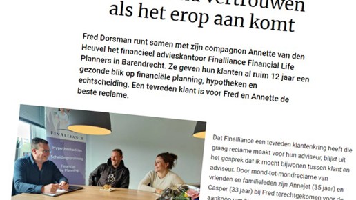 Fred Dorsman runt samen met zijn compagnon Annette van den Heuvel het financieel advieskantoor Finalliance Financial Life Planners in Barendrecht. Ze geven hun klanten al ruim 12 jaar een gezonde blik op financiële planning, hypotheken en echtscheiding. Een tevreden klant is voor Fred en Annette de beste reclame.